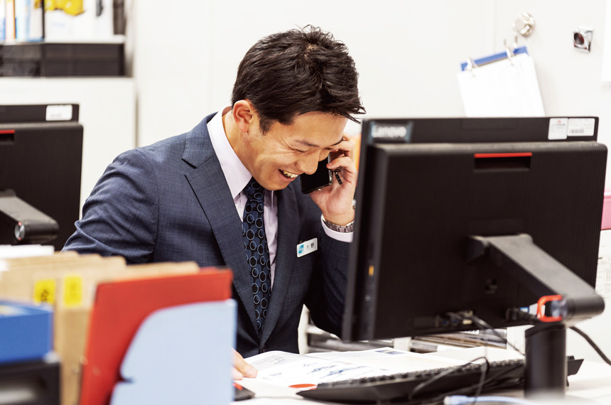 営業担当として、工事現場を訪問し、商談を行っています。何回も現場を訪問し、まず顔や名前を憶えてもらい、お客様のニーズを探り、作戦を考えていきます。 お客様と信頼関係が築け、自分で考えた通りの営業戦略が成功したときには大きなやりがいを感じます。 また、私自身は人と話すのが好きで、より多くの人と関わりたいと思い入社しましたので、沢山の人との出会いも仕事の魅力です。 人と人とのつながり、支え合いの中で仕事ができ、沢山の人やお客様の笑顔を見ることができます。 また、今は新人・後輩の育成も大事な役割で、新人や後輩を育てることで自分自身も成長でき、みんなが成長することにより会社全体の成長にもつながると日々実感しています。