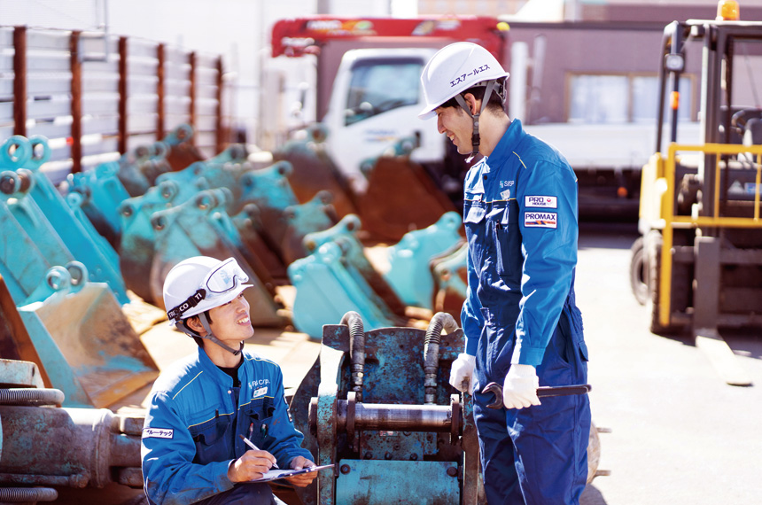 油圧パワーショベルのアタッチメントの点検整備、お客様のご注文に合わせた準備作業、ユニットハウスやシャッター倉庫の清掃、出庫入庫時の点検や修理、ご注文に合わせた備品の入れ込みや営業所へご来社されたお客様の対応などをしています。 その他にはお客様のところへ伺った際にはレンタルや販売商品のPRなどの営業活動なども行います。 急な注文が入り、すぐに納品に行くと、ありがとう助かったよと声を掛けられることがあります。 自分のやっている仕事が感謝されたときはとても嬉しいです。 また、実際に自社の商品を使って作業をしているのを見たときには、自分たちがやっている仕事が世の中に貢献できていることが実感でき、やりがいを感じます。